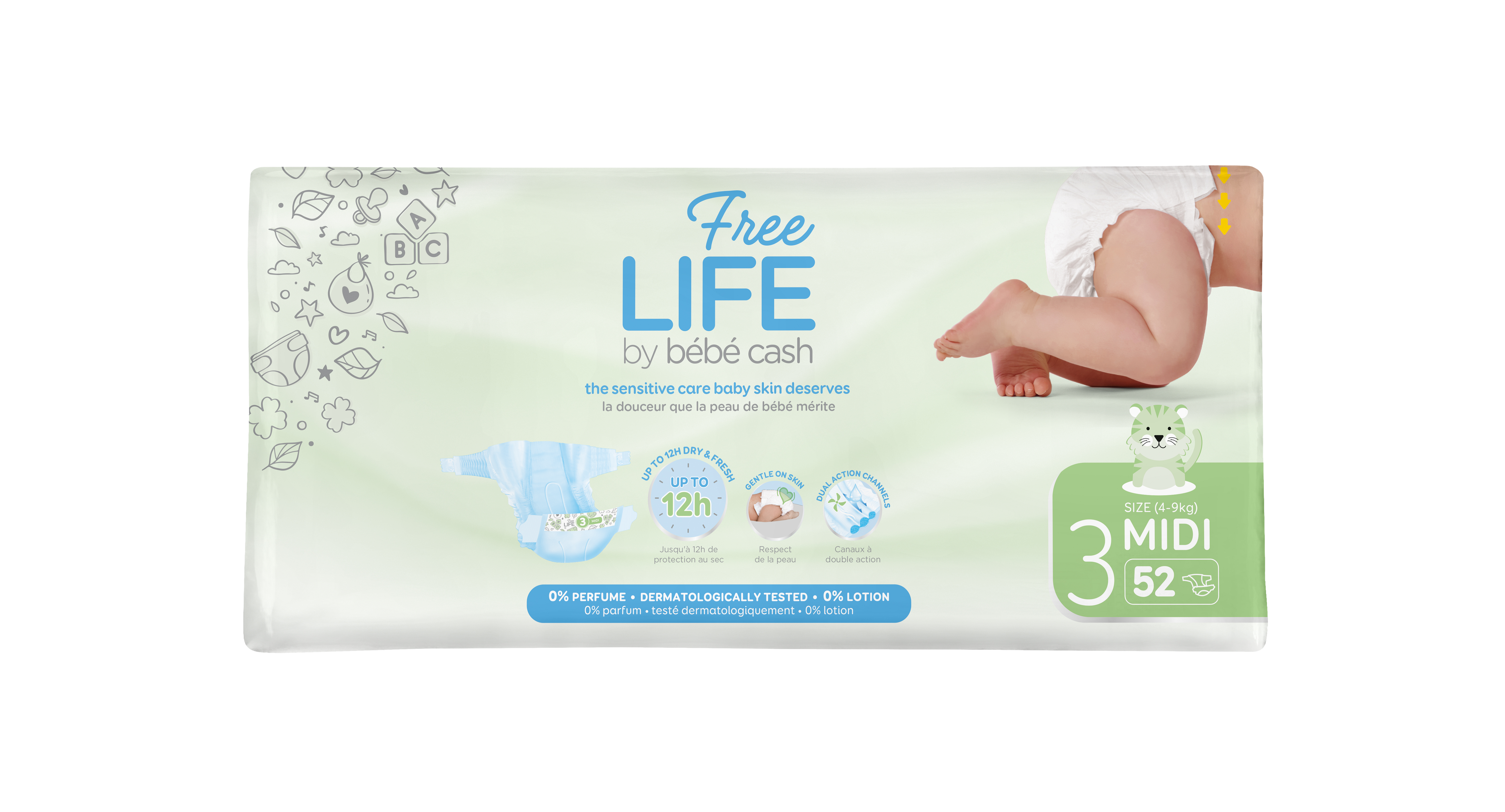 Couches BBCash Free Life Midi 4-9kg, 2 sachets de 52 couches par carton, soit 104 couches au total. Ces couches pour bébés BBCash Freelife sont fabriquées en France, testées par des dermatologues et garanties 0% d'allergènes pour protéger la peau. Elles offrent une protection anti-fuites améliorée grâce à des élastiques latéraux, une absorption renforcée assurant un séchage long et agréable, un molleton intérieur doux, une bonne respirabilité, et un confort de port accru par des pièces élastiques souples plus mobiles. Des poignets supplémentaires et des verrous latéraux offrent une excellente protection contre les fuites.