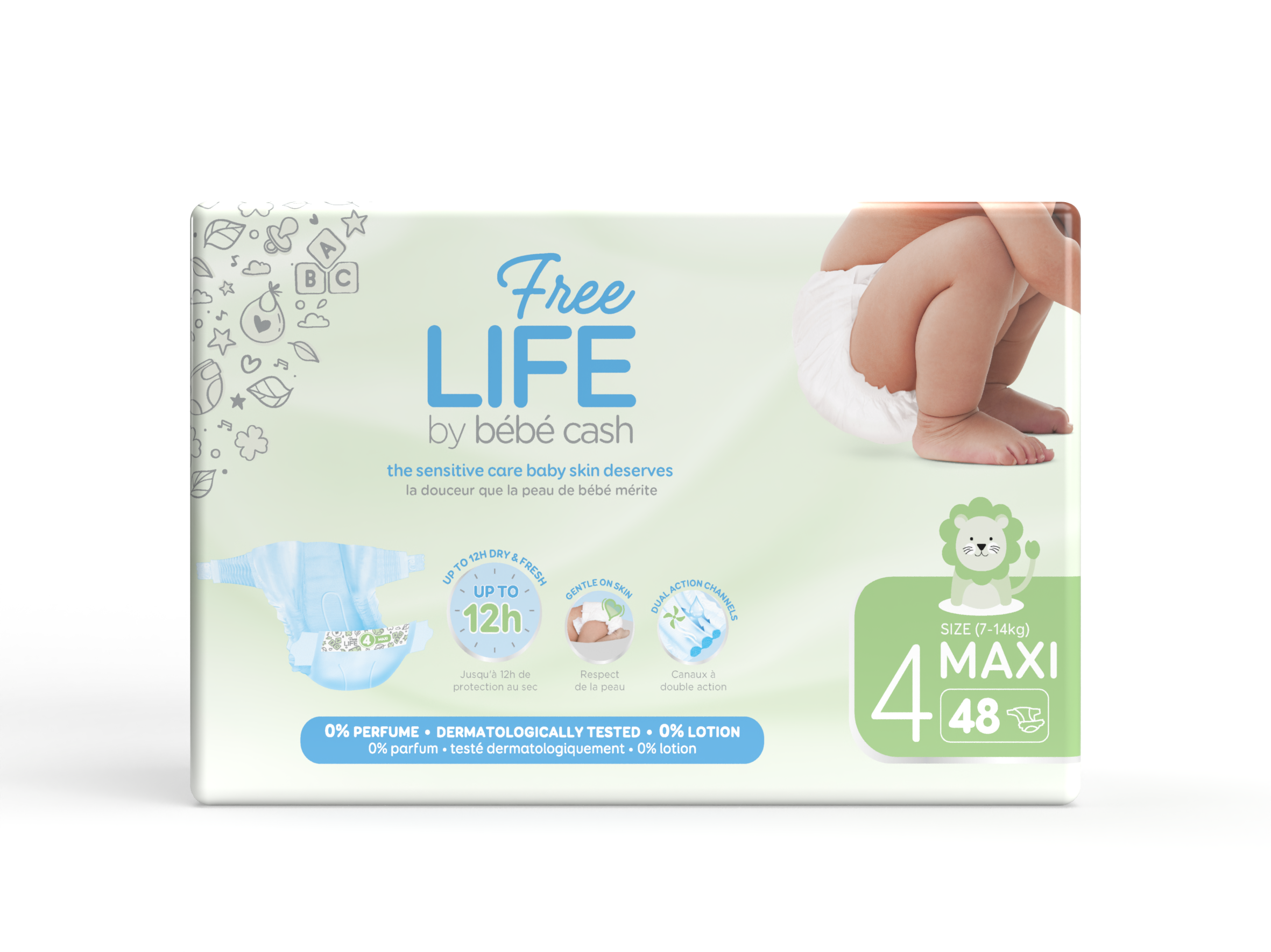 Couches T4 BBCash Freelife Maxi 7-14kg (96 couches par carton, 2 sachets de 48) : 0% d'allergènes, elles protègent la peau et sont testées par des dermatologues. Elles offrent une protection anti-fuites améliorée, des élastiques latéraux et une absorption renforcée grâce à une couche absorbante supplémentaire pour un séchage long et agréable. Le molleton intérieur doux, la bonne respirabilité et le confort de fabrication avec des pièces élastiques souples mobiles contribuent à un confort de port accru et une tenue sûre. Fabriqué en France.