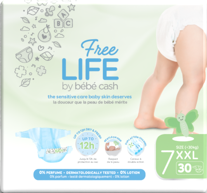 Couches BBCash Free Life T7 pour les bébés de +15kg. Chaque carton contient 3 sachets de 30, soit 90 couches au total. Ces couches BBCash Freelife sont testées par des dermatologues, garanties 0% d'allergènes et protègent la peau. Elles offrent une protection anti-fuites améliorée grâce à des élastiques latéraux et des verrous, une absorption renforcée pour un séchage long et agréable, une bonne respirabilité, et un confort de port accru grâce au molleton intérieur doux et à des pièces élastiques souples. Fabriqué en France.